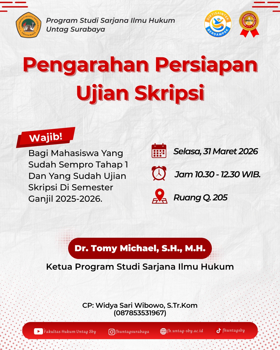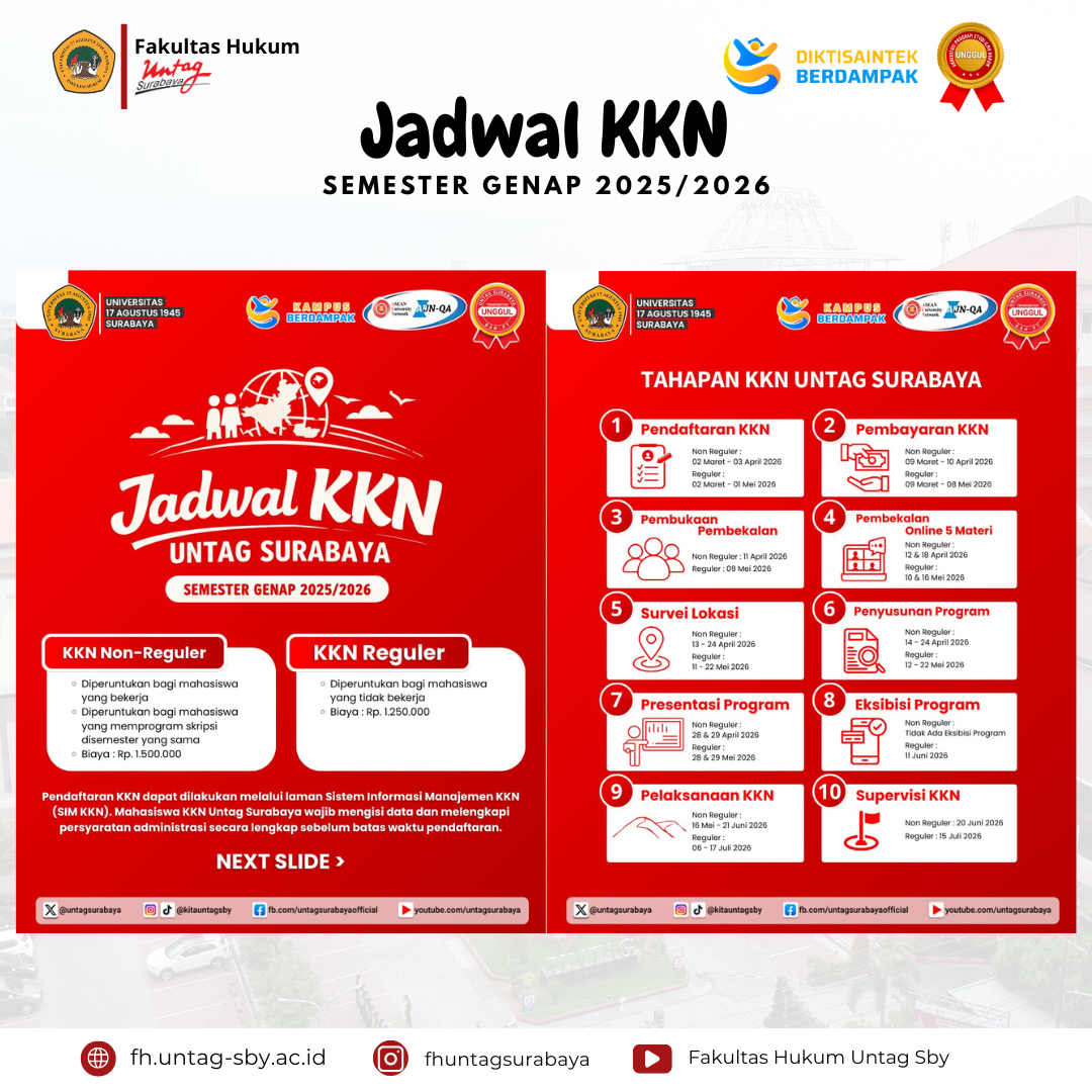 Surabaya – Fakultas Hukum Universitas 17 Agustus 1945 (UNTAG) Surabaya resmi mengumumkan jadwal pelaksanaan Kuliah Kerja Nyata (KKN) Semester Genap Tahun Akademik 2025/2026. Program KKN ini menjadi salah satu kegiatan akademik yang bertujuan memberikan pengalaman langsung kepada mahasiswa dalam mengabdikan ilmu pengetahuan kepada masyarakat.